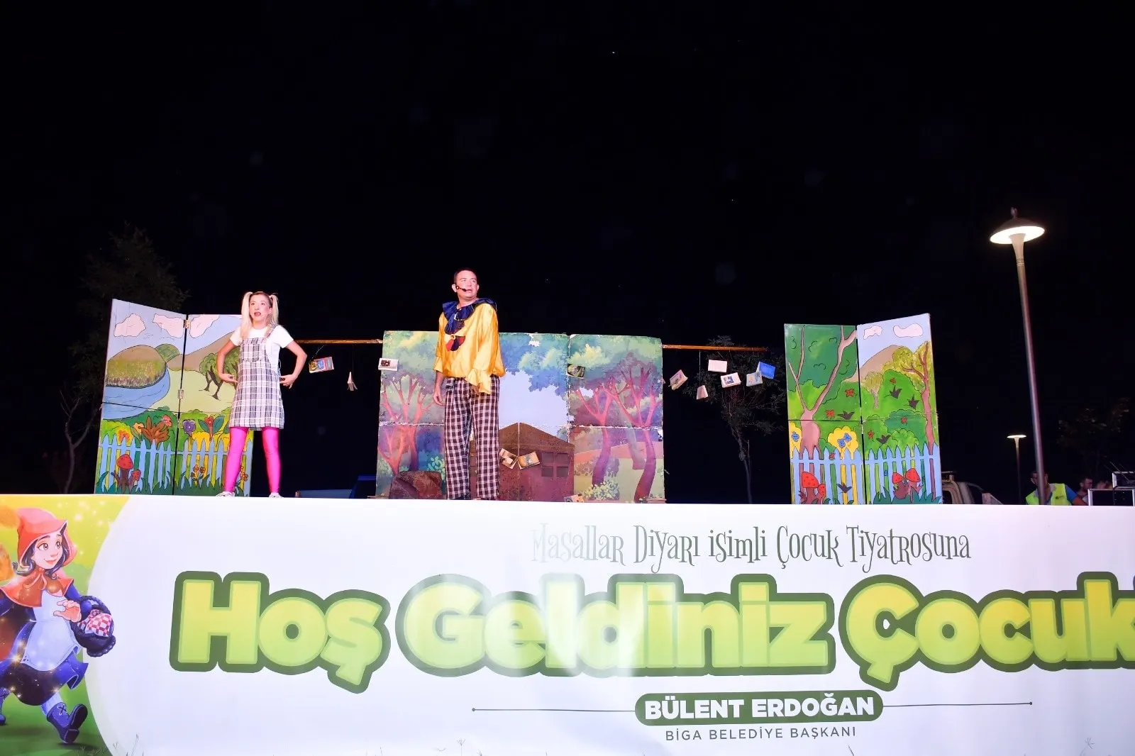 Biga Belediyesi tarafından Adapark'ta düzenlenen Masallar Diyarı adlı müzikli çocuk tiyatrosu yoğun ilgi görürken, aileler ve çocukları eğlenceli vakit geçirdi.
