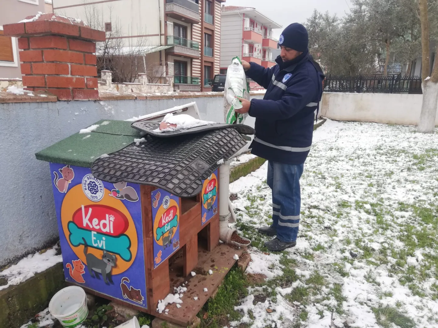 Biga Belediyesi’nden yapılan açıklamada, “Can dostlarımıza sahip çıkmaya devam ediyoruz. Etkili olan kar yağışı ve havaların soğuması nedeniyle yiyecek bulmakta zorlanan sokak canlarımız için ekiplerimiz birçok noktada mama dağıtım çalışmalarına devam ediyor” denildi.